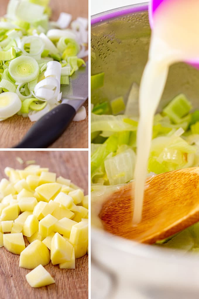 - Rinse and slice the leek. Heat the oil in a small to medium pot and add the leek. Saute fo 2-3 minutes. Meanwhile, rinse and dice the potato(the smaller the potatoes, the quicker they cook). Add the potato to the pot altogether with vegetable stock and water.